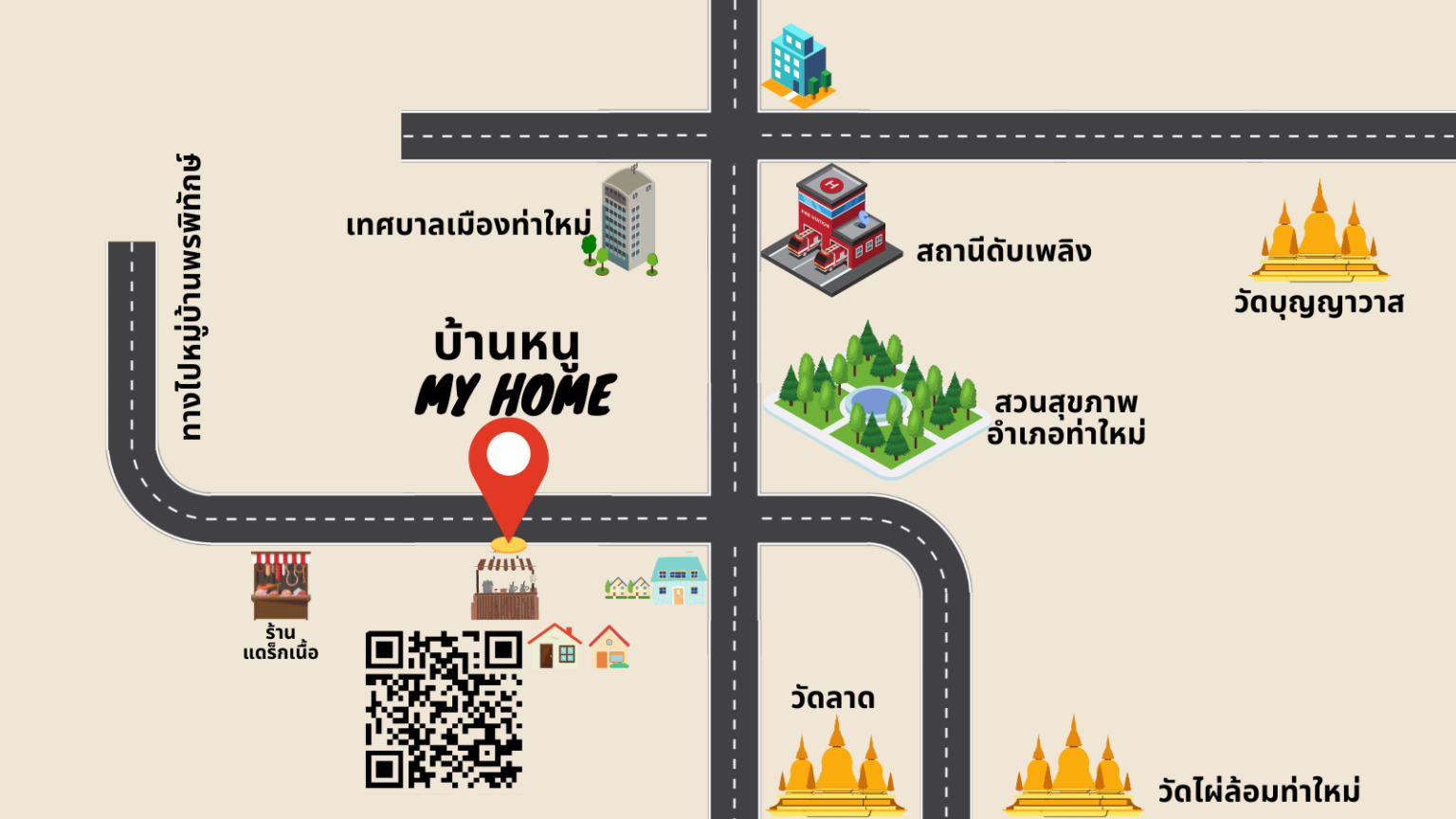 มุ่งหน้ามาทางสวนสุขภาพอำเภอท่าใหม่ เมื่อถึงแยกสวนสุขภาพอำเภอท่าใหม่ และ เลี้ยว ขวาไปทาง หมู่บ้านพรพิทักษ์ เป็นบ้านน็อคดาว์หลังเล็กๆสีขาว เลยจากแยกไป 100 เมตร